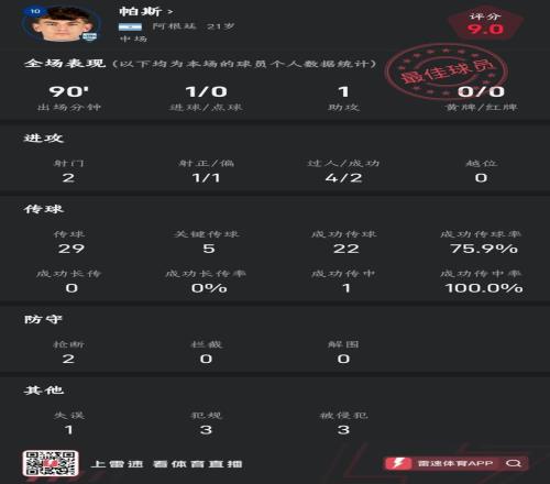 但在临场对决中,阿根廷新星帕斯的表现完全碾压土耳其新星伊尔迪兹。帕斯此役踢满90分钟贡献1射1传。帕斯全场2次射门1次射正攻入1球,4次尝试过人其中2次过人成功。传球方面,帕斯全场完成29次传球,22次传球成功(含5次关键传球、1次助攻),传球成功率达到75.9%。此外,帕斯此役2次抢断、3次被侵犯,另有1次失误及3次犯规。