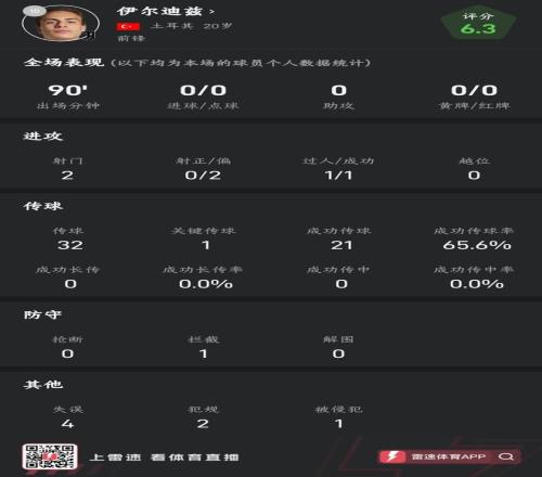 伊尔迪兹同样踢满90分钟,全场2次射门全部射偏。1次尝试过人且成功。传球方面,伊尔迪兹全场32次传球,其中21次传球成功(含1次关键传球),传球成功率65.6%。防守端,伊尔迪兹全场仅完成1次拦截。此外,伊尔迪兹全场4次失误、2次犯规且1次被侵犯。
