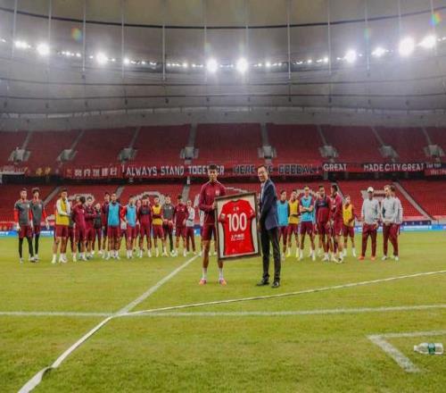 训练开始前,海港俱乐部党总支书记、总经理沙良昌分别为莱昂纳多颁发中超联赛第25轮最佳球员奖项,为李帅颁发百场纪念球衣。