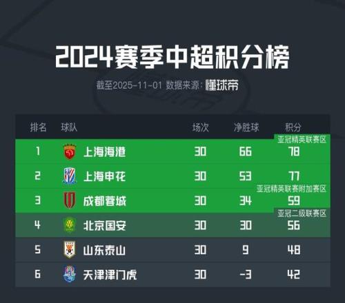 北京时间11月1日,中超第29轮,北京国安与山东泰山分别战胜各自对手全取3分,至此国安与泰山分别锁定中超第四、第五。