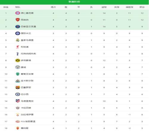 随着拜仁21巴黎,利物浦10皇马,欧冠最新积分榜:阿森纳升第二