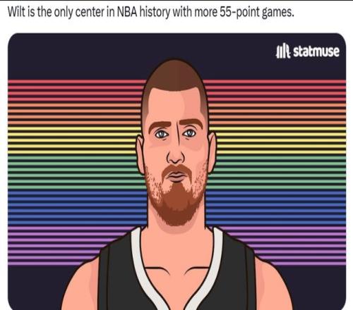 第三,在NBA历史上,只有威尔特-张伯伦比约基奇拥有单场55分场次最多的中锋。