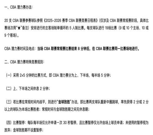 根据官方文件披露,CBA潜力赛采用2×5分钟的比赛方式,上下半场各5分钟,中间休息2分钟。若常规时间战平,比赛将进入激动人心的 “金球致胜”环节——双方重新中圈跳球,率先获得2分或2分以上的球队获胜