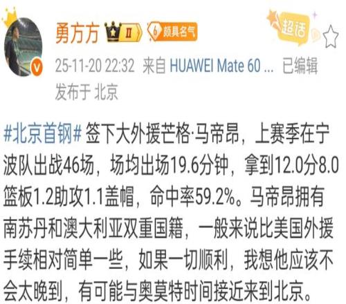 根据北京媒体报道,上赛季在宁波富邦打球的外援马帝昂确定会加盟北京首钢,要知道他是被宁波富邦放弃离开CBA赛场的,同时一个月前他因为伤病被韩国球队裁掉,许利民这样力排众议,的确有些看不懂。