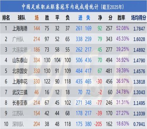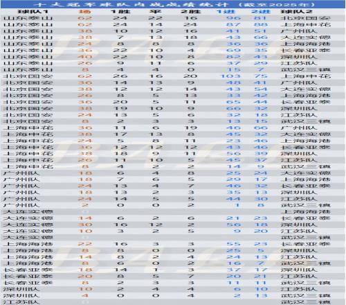 下图是10支获得过中超&甲A冠军的球队之间的历史交锋总成绩,完全去掉了各队与其他非冠军球队的成绩。