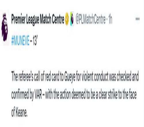 北京时间11月25日04:00,英超联赛第12轮,曼联坐镇主场迎战埃弗顿。上半场13分钟,盖耶与队友基恩发生冲突领红下场。(后续英超官方给出解释:“主裁判认定盖耶实施暴力行为并出示红牌的判罚,经VAR技术核查确认,该动作被判定为对基恩面部的明显击打动作。”)