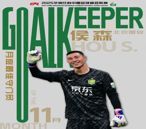 12月8日,中超官方公布11月最佳守门员,北京国安的侯森当选。 侯森在11月的2场联赛中完成了11次扑救,扑救成功率高达91.7%。 注:11月评选范围为第29-30轮,共计2轮,参选球员数据以上述2轮比赛数据为准。
