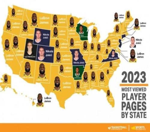 北京时间12月11日,据数据网站BBR显示,其网站今年在各州被浏览次数最多的球员页面分别是:詹姆斯(47个州)、亚历山大(俄克拉荷马州)、约基奇(科罗拉多州)、字母哥(威斯康星州)。加拿大也几乎都被詹姆斯占据。