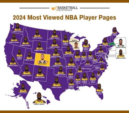 图片显示, BBR2024年美国各州被浏览次数最多的NBA球员也是詹姆斯,没被詹姆斯“占领”的州只有科罗拉多州(约基奇)、威斯康星州(字母哥)和马萨诸塞州(塔图姆)。