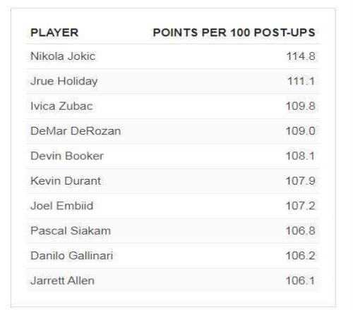 上赛季,约基奇一个人就使用了全联盟5.7%的低位背打。作为对比,面筐单打(亚历山大)和挡拆持球(特雷·杨)的联盟领跑者所占比例仅为各自进攻类型的2%。而约基奇在如此大量的低位背打中占据如此统治地位,以至于他一个人就将整个联盟的低位背打效率每100回合提高了1.1分。