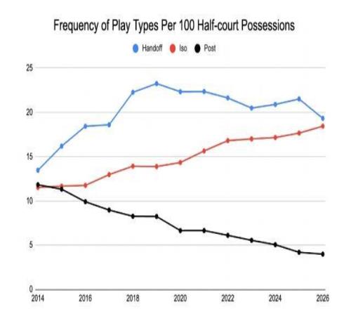 确实,在2010年代末期,NBA正处于巨大的战略变革之中,而低位背打是主要的牺牲品。在2013-14赛季,NBA每100次半场进攻中平均有11.8次低位背打,与面筐单打和手递手配合的频率大致相当。但自此之后,面筐单打和手递手的频率增加了50%以上,而低位背打却下降了三分之二,在2025-26赛季每100次半场进攻中只有4.0次。