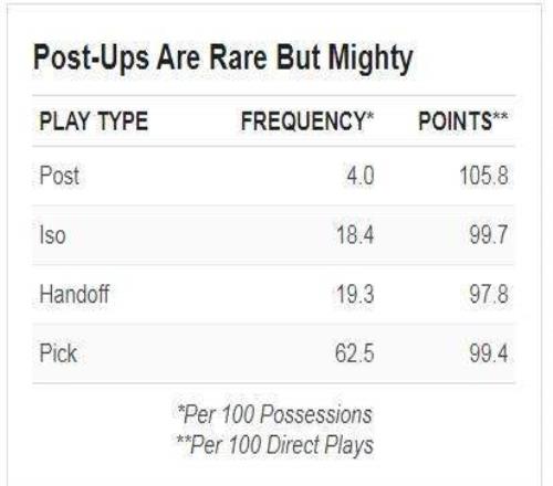 随着数据分析在NBA扎根,低位背打的数据也有所改善,因为球队正在寻找更好的情境来调用这种战术。当今多才多艺的大个子和快节奏、拉开空间的风格,使得低位背打模式比前几十年更具效率。