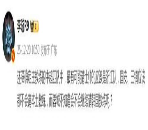 媒体人李璇写道:“还没确定主教练的中超四队中,最有可能请土帅的应该是浙江队,北京国安、武汉三镇应该都不会请本土教练,而成都蓉城不知道会不会继续请韩国教练呢?”